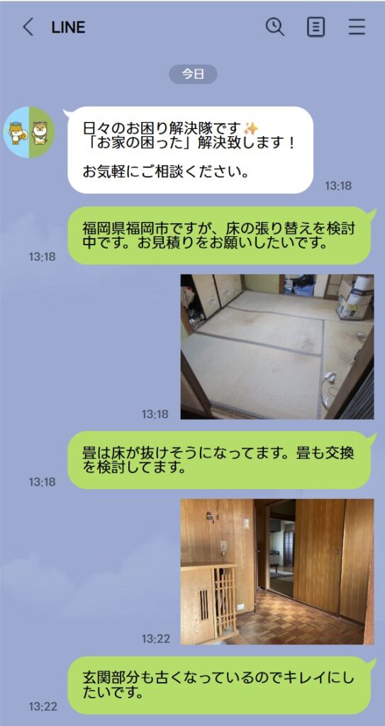 LINEから簡単に現地見積り(無料)や修理のご相談が可能です。