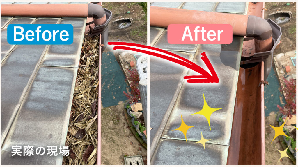 ごみの量はそこまで溜まっていませんでしたが、落葉が雨樋にこびり付いていましたのでしっかりとブラシでこすって落とし、お客様にも喜んでいただきうれしく思います!