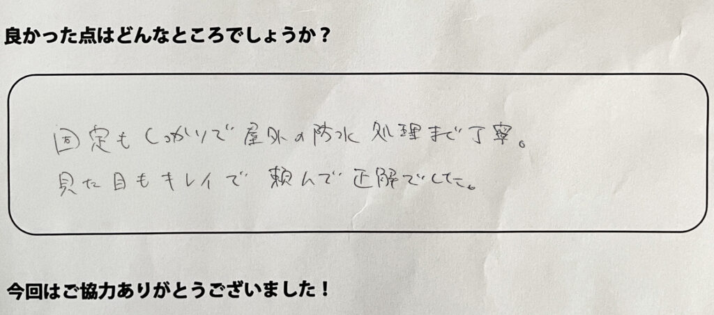 固定もしっかりで屋外の防水処理まで丁寧。見た目もきれいで、頼んで正解でした。