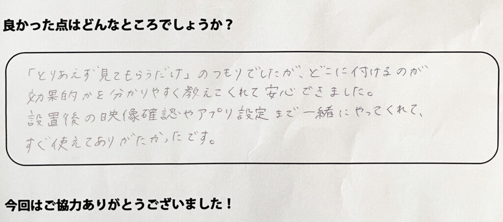 「とりあえず見てもらうだけ」のつもりでしたが、どこに付けるのが効果的かを分かりやすく教えてくれて安心できました。設置後の映像確認やアプリ設定まで一緒にやってくれて、すぐ使えてありがたかったです。