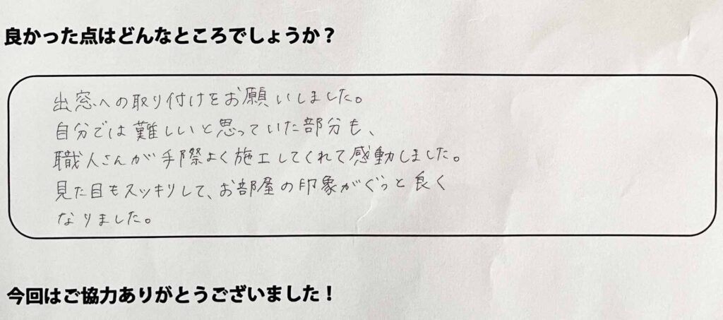 出窓への取り付けをお願いしました。自分では難しいと思っていた部分も、職人さんが手際よく施工してくれて感動しました。見た目もスッキリして、お部屋の印象がぐっと良くなりました。