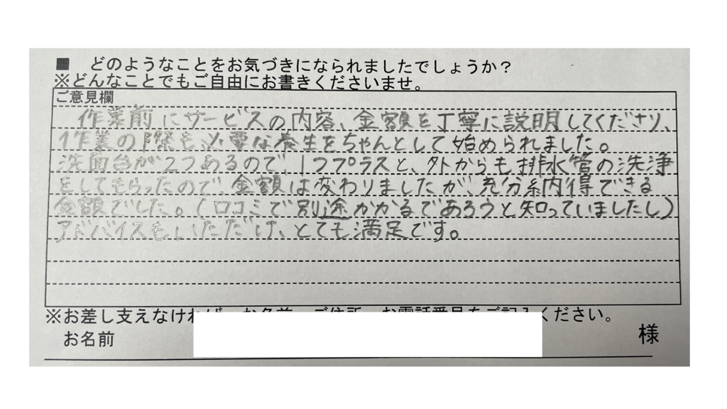 作業前にサービスの内容、金額を丁寧に説明してくださり、作業の際も必要な事をちゃんとお伝えして始めてくれました。洗面台が2つあるので1つプラスと、外からも排水管の洗浄をしてもらったので金額は変わりましたが、充分納得できる金額でした。アドバイスもいただけて、とても満足です。