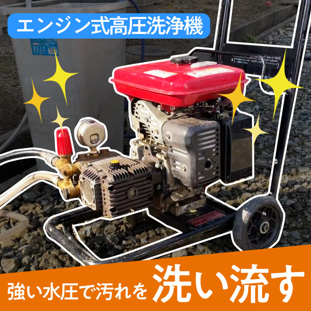 エンジン式の高圧洗浄機を使い、強い水圧で汚れを洗い流していきます。