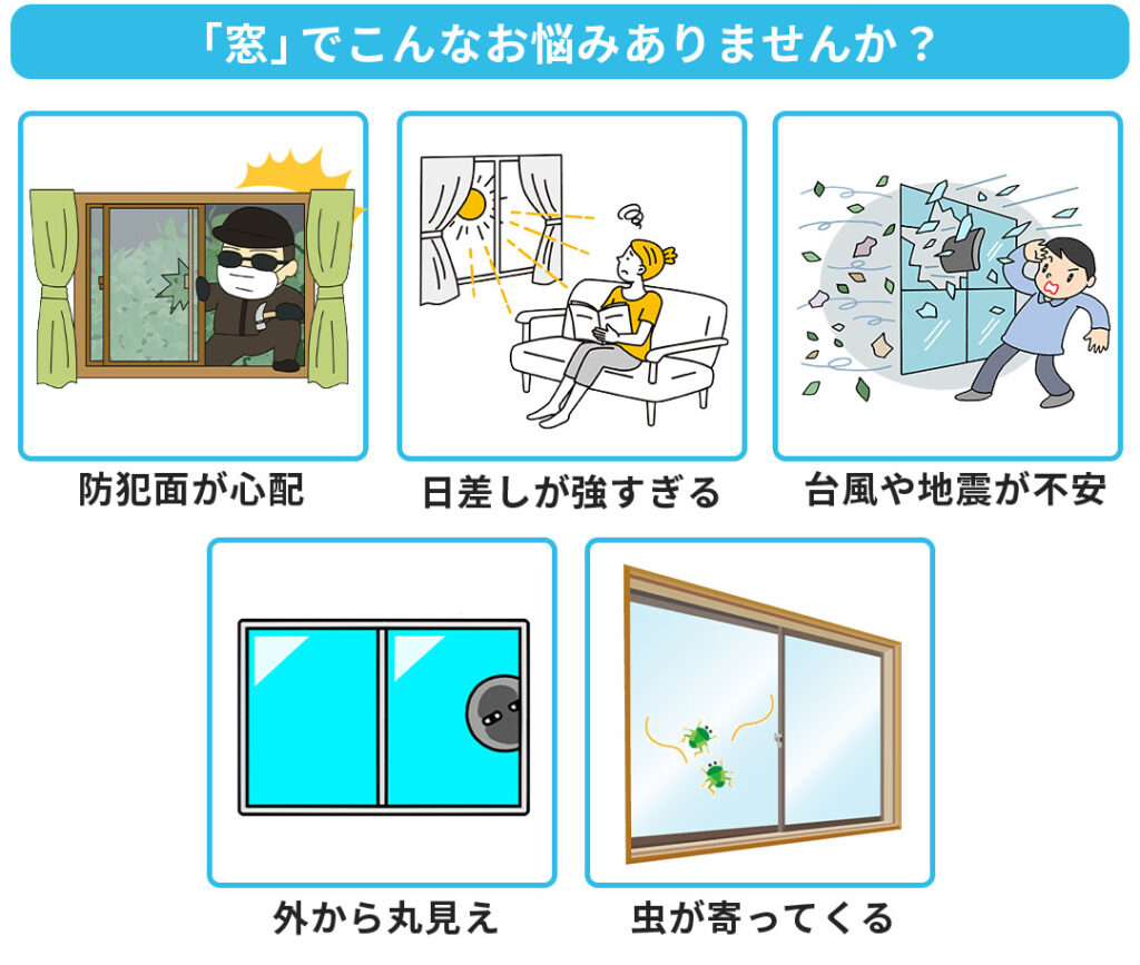 窓フィルムで解決できる窓のお困りごとはたくさんあります。災害対策、紫外線、防犯、暑さ寒さ、抗菌などなど。フィルムを貼るだけでびっくりするほど快適な生活になります!