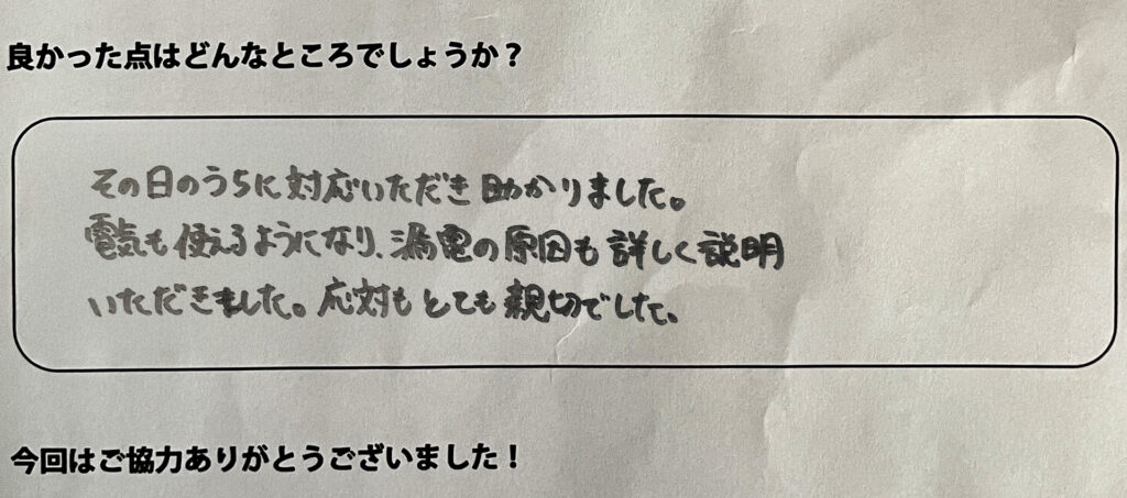 その日のうちに対応いただき助かりました。電気も使えるようになり、漏電の原因も詳しく説明いただきました。応対もとても親切でした。
