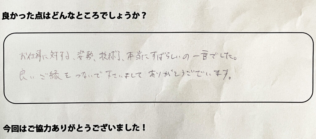 お褒め頂き恐縮です!ありがとうございます。これからも技術向上とお客様が安心できる対応を磨いていきたいと思います!
