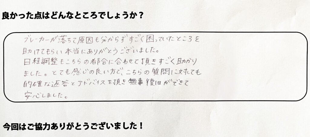 ブレーカーが落ちて原因も分からずすごく困っていたところを助けてもらい本当にありがとうございました。日程調整もこちらの都合に合わせて頂きすごく助かりました。とても感じの良い方で、こちらの質問に対しても的確な返答とアドバイスを頂き無事復旧ができて安心しました。