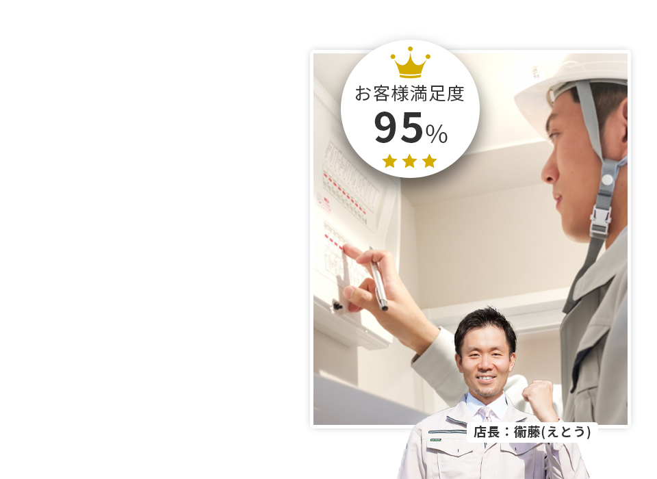 1分でも早くお客様のもとに駆け付けられるよう、信頼できる電気工事士を自社で開拓し、各地で提携をしております。一方、専門性・経験・良識を日々更新し続けない方は加盟を継続できない措置もとっております。お客様ファーストで親身な対応のできる方のみ加盟しているため、お客様自身で「だまされたくないから…」と、たくさんのサイトを比較したり、口コミを調べたり、といった悪徳か優良かどうかを選別する手間を減らせます。