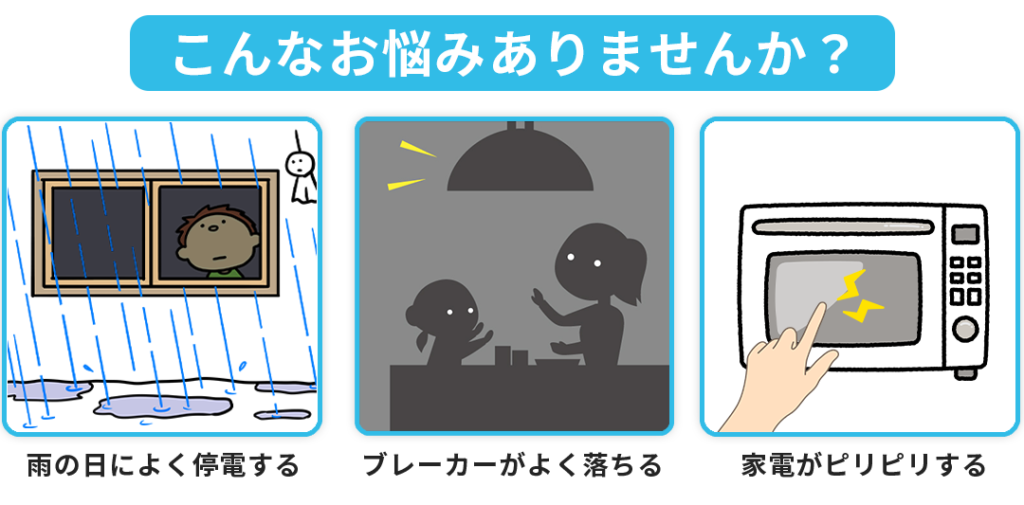 上記の症状一つでも当てはまるときは漏電(ろうでん)の可能性が疑われます。漏電はどんなご家庭でも起こる可能性があり、感電や火災を引き起こす危険な現象です。